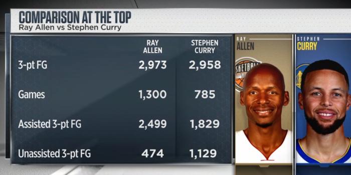 库里已经命中2958记三分,受助攻命中1829记三分,非受助攻命中1129记三分,仅仅只用了785场;雷阿伦职业生涯1300场比赛,总共投进2973记三分,受助攻命中2499记三分,非受助攻命中474记三分。