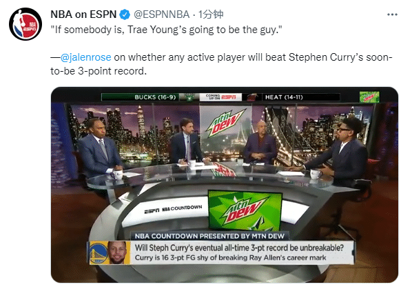 本赛季,库里场均能够投进5.5记三分,三分命中率是41.6%,距离雷阿伦仅仅只差15记三分,库里很快就能加冕历史三分第一人;那么未来有谁能超越库里的三分纪录吗?前NBA球员、现任评论员杰伦-罗斯表示特雷-杨能做到。