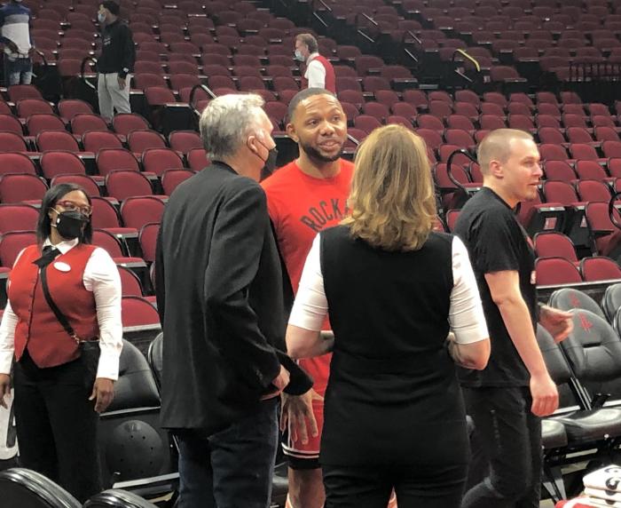 火箭6连胜创纪录,火箭前主帅德安东尼(现任鹈鹕教练顾问)亲眼见证,赛前德帅拥抱杰拉德-格林,并且和戈登寒暄聊天。