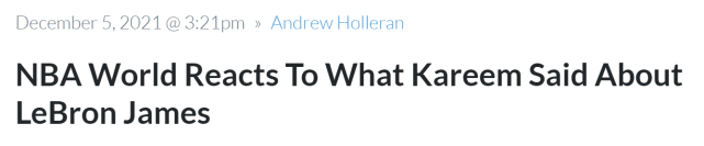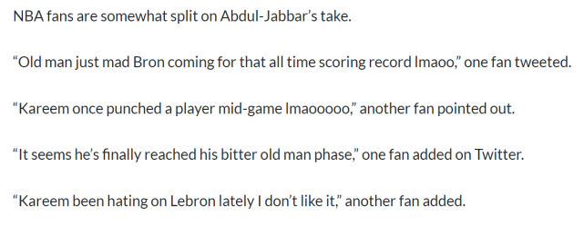 一个球迷写道:“布朗(詹姆斯的昵称)冲着他的生涯得分纪录来了,老头子抓狂了。”还有一个球迷指出贾巴尔也并非圣人:“他在比赛中还打过一个球员。”
