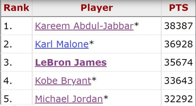 贾巴尔累计得到38387分,排名历史第一位。生涯至今,詹姆斯已经得到35674分,排名历史第三位,他还需要拿到2714分,就能超越贾巴尔,成为历史得分王。如果以詹姆斯本赛季25.6分的场均得分速度来计算,他还需要大概106场比赛完成超越。