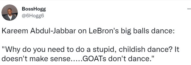 贾巴尔在视频里说道:“他为什么要跳一种愚蠢、幼稚的舞蹈呢?这是不尊重对手的做法,而且毫无意义。GOAT(历史最佳)不跳舞。”在此前击败步行者的一场比赛中,詹姆斯命中关键三分后跳起联盟禁止的“卡塞尔舞”,最终被联盟罚款15000美元。