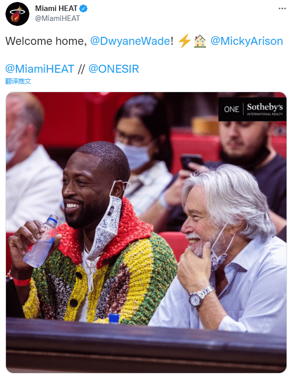 热火官方晒出韦德坐在场边观战的帅照,发推写道:欢迎回家!