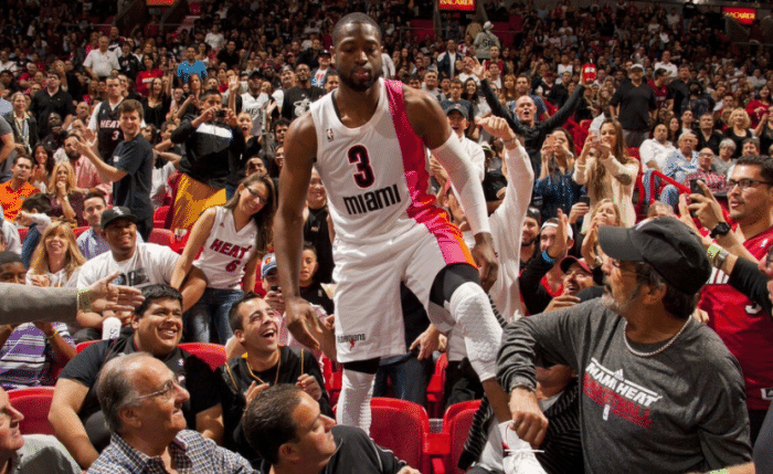 178直播11月19日讯 ,NBA常规赛热火主场对阵奇才,热火名宿德韦恩-韦德现身迈阿密美航中心球馆,全场球迷为他欢呼鼓掌,期间,韦德被哈斯勒姆推离球场太有趣。