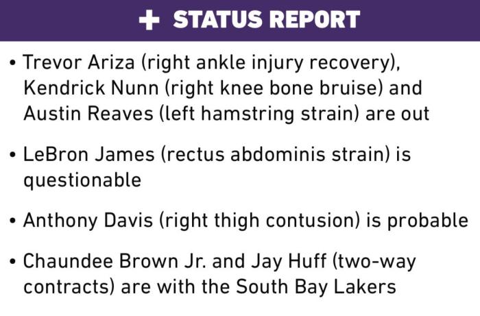 北京时间11月19日,湖人官方公布最新伤情报告,阿里扎、纳恩和里夫斯都因伤继续缺战,詹姆斯的出战状态已经从缺席升级为出战成疑(50%可能性出战),浓眉(右大腿挫伤)大概率出战,两名双向合同球员胡夫和布朗被下放到发展联盟。