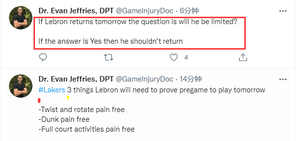 Evan Jeffries详解詹姆斯复出的前提条件——一是扭动和转身无痛感,二是扣篮无痛感,三是全场活动无痛感;该医学专家还表示如果詹姆斯的身体受到限制,他就不应该复出。