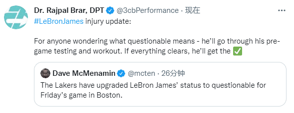 自从受伤之后,詹姆斯已经休养16天并且因腹部拉伤连续缺席8场比赛,现在被列为出战成疑,这是不是意味着詹姆斯下一场会复出呢?医学专家Rajpal Brar解析詹姆斯出战成疑:对于任何想知道出战成疑意味着什么的人来说,他将进行赛前测试和训练。如果一切顺利的话,他就会复出。