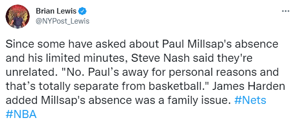 据篮网记者Brian Lewis报道,当有人问米尔萨普的缺席是否与上场时间受限有关时,纳什表示两者没关系:不,米尔萨普因个人原因离开球队,这与篮球无关;哈登透露米尔萨斯是因家庭问题而缺席比赛。