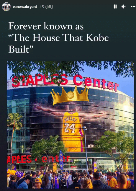 对于湖人主场斯台普斯球馆更名这件事,科比遗孀瓦妮莎转发动态,并且为科比配上王冠,配文写道:(斯台普斯)永远都被称为科比打造的球馆。