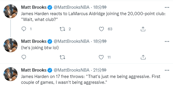 谈到本场19次罚球,哈登表示:仅仅是因为我整场都打出了侵略性,前几场我没有侵略性。