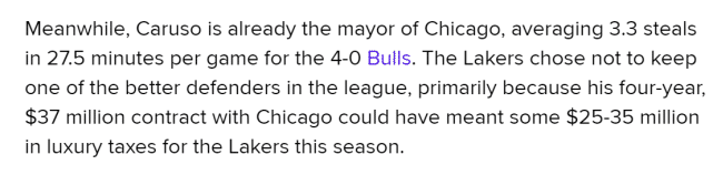 Pincus调侃,卡鲁索现在已经成为“芝加哥的市长”,场均27.5分钟就能贡献3.3次抢断。公牛只用4年3700万美元签下他,但如果湖人也用这个价格签卡鲁索,那意味着他们今年要多交2500万-3500万的奢侈税。管理层决定省下这笔钱,却给球场上留下了大麻烦。
