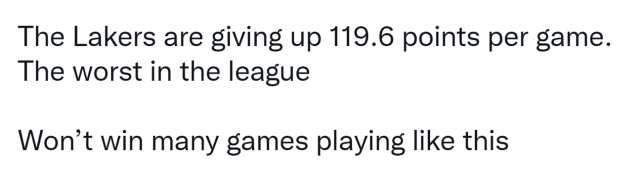 这个赛季的前5场比赛,现实很残酷,湖人的场均失分是倒数第一,防守效率只有111.4,也就是百回合失111.4分,排在联盟第25位。Pincus表示,要是灰熊的莫兰特和马刺的珀尔特尔多进几个罚球,湖人甚至可能是0胜5负的开局。