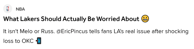 谈到湖人目前的问题,Eric Pincus提到了很多方面。比如,小乔丹该不该首发?威少和詹姆斯是不是匹配?威少打得会不会太快?湖人进攻会不会很糟糕?伤病影响了湖人战绩?湖人的阵容年龄是不是太老了?不过,最终Eric Pincus指出,和上述这些问题相比,湖人最该担忧的是他们的防守:昔日的优势,已经成为如今的短板。