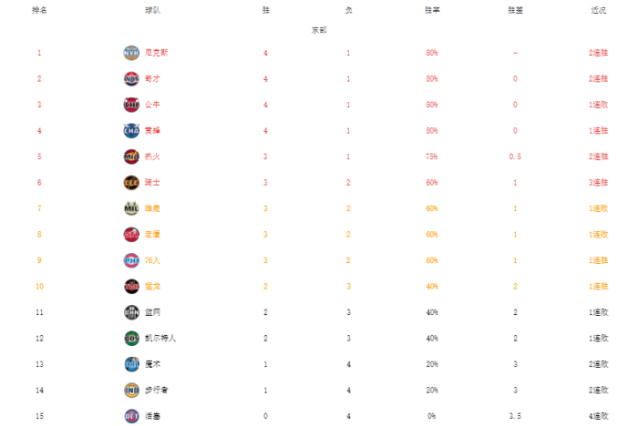 178直播10月29日讯 随着尼克斯在芝加哥拿下胜利,送给公牛首败,本赛季常规赛东部已经没有全胜的球队了。这个赛季东部的格局非常混乱,开始前大家更多的预期是篮网、雄鹿领跑,热火、公牛和猛龙崛起,步行者等队搅局。但没想到的是新赛季的东部变动很大,黑马也展开了大混战。