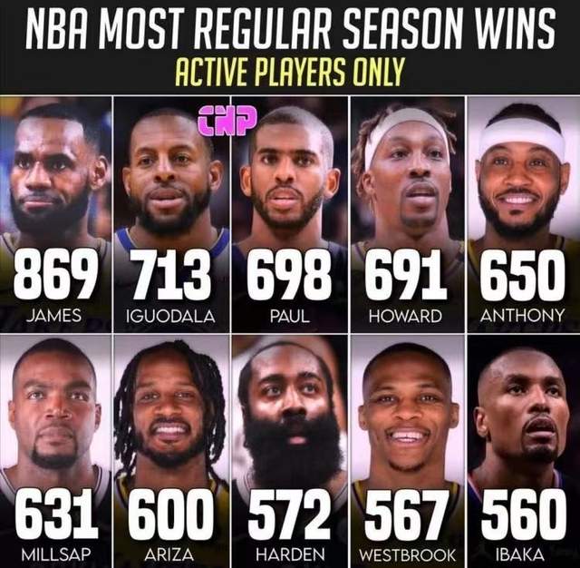 先来说一说詹姆斯,任何纪录和成就我们都要优先提到詹姆斯。詹姆斯就是荣誉收割机,生涯至今詹姆斯的常规赛取胜场数接近900场。869场常规赛胜利在现役球员中独居一档,无人能接近。