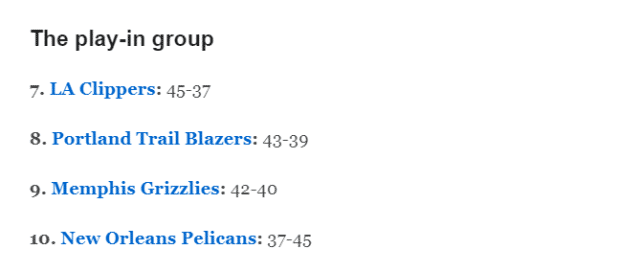 ESPN预测失去小卡的快船,战绩将掉到西部第七,进入附加赛区域。休赛期没有太大动作的开拓者,也不被看好,他们预测战绩位居第八。灰熊和鹈鹕将出现在第九和第十的位置上,在竞争激烈的西部,他们很难获得更高的排位。莫兰特和锡安的能力不错,但也暂时无法将球队提升一个档次。