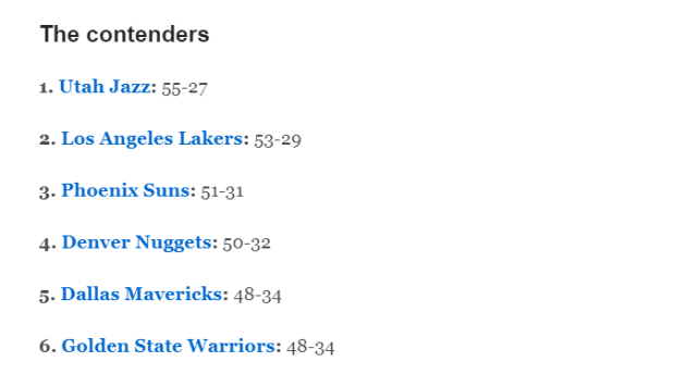 ESPN预测湖人至少不会在常规赛就成为西部最好的球队,威少还需要融入湖人的体系,球权分配也需要在比赛中磨合,另外,他们毕竟有9位至少32岁的球员,浓眉的伤病史也令人担忧。因此,ESPN预测湖人在常规赛的战绩位居西部第二。被排在第一的是爵士,2020-21赛季,爵士就是常规赛联盟战绩最好的球队,他们有望延续这一表现。