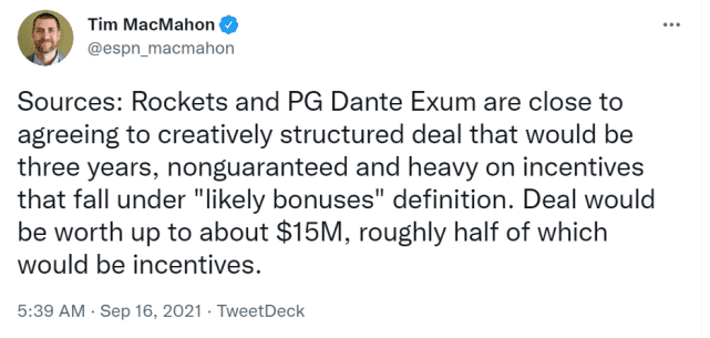 178直播9月16日讯 ,据名记Tim MacMahon报道,消息人士透露,火箭与埃克萨姆接近达成一份3年1500万美元的无保障合同。这份合同很特别,三年无保障,总金额近一半为非常可能得到的奖金,因此,当埃克萨姆被交易时,奖金可以被计入工资。这些奖金将主要基于他的平均上场时间及比赛正负值。