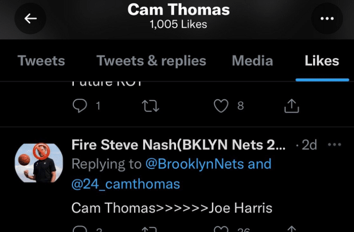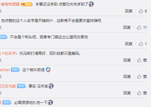 这是在有神奇表现之后,网友在社交媒体上表示托马斯>>>>>>>乔-哈里斯,意思是新秀托马斯的能力尤其是三分球能力要远远强于乔哈。卡梅隆-托马斯进行点赞,而且几天之后依旧存在,也就是说明卡梅隆-托马斯这并非是手滑,他已经给新赛季自己的队友一个“下马威”,方式就是社交媒体的点赞,而且还不取消。