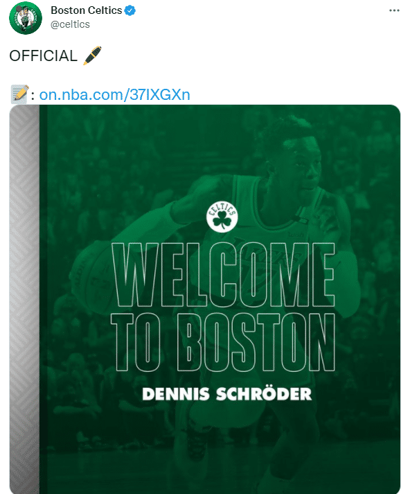 178直播讯 北京时间8月14日,波士顿凯尔特人正式官宣签约施罗德;凯尔特人晒出施罗德旧照,发推:官方正式签约,欢迎施罗德来到波士顿;凯尔特人还晒出施罗德上赛季身穿湖人17号球衣的集锦。