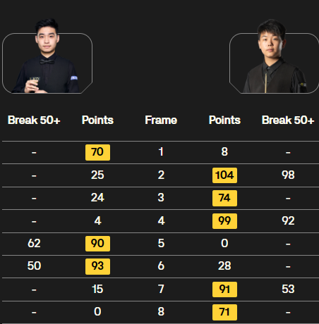 开场阶段:斯佳辉在首局中表现出色,以70:8的比分先下一城,取得1-0的领先。然而,在接下来的几局中,巩晨智逐渐找到状态,连续打出单杆98分和92分的高分,连胜三局,将比分反超为3-1。