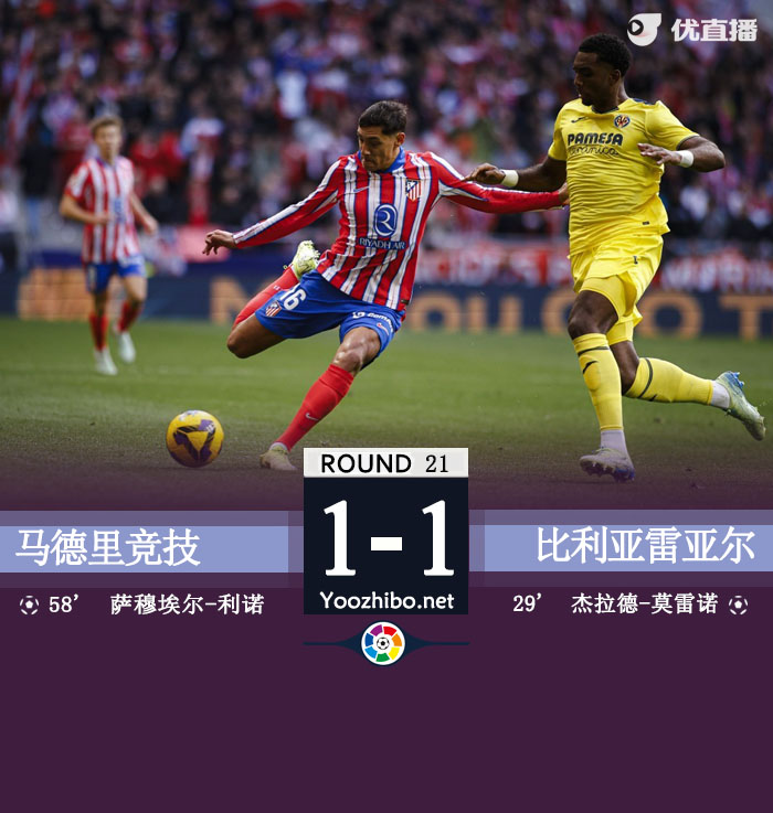178直播讯 北京时间1月25日23点15分,西甲第21轮,马德里竞技坐镇主场利雅得航空大都会球场,迎战比利亚雷亚尔。上半场,曼达瓦送点,莫雷诺亲自主罚点球得分。下半场,利诺扳平比分,随后两队多次制造威胁但都没有把握住。最终,马德里竞技1-1战平比利亚雷亚尔。