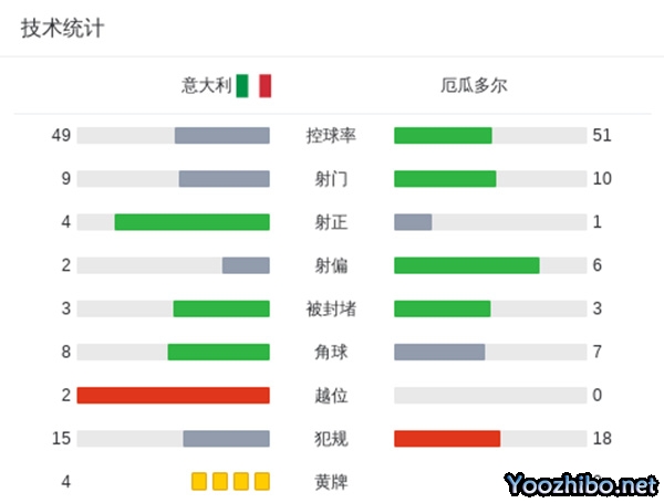 双方出场阵容: 意大利首发:12-维卡里奥、13-达米安、16-曼奇尼、23-巴斯托尼、25-贝拉诺瓦(46' 2-迪洛伦佐)、3-迪马尔科(88' 24-坎比亚索)、18-巴雷拉、8-若日尼奥(67' 5-洛卡特利)、10-佩莱格里尼(67' 19-弗拉泰西)、22-扎尼奥洛(76' 17-奥尔索里尼)、11-拉斯帕多里(76' 9-雷特吉) 意大利替补:1-多纳鲁马、21-卡内塞基、4-布翁乔尔诺、15-斯卡尔维尼、7-博纳文图拉、14-基耶萨、20-扎卡尼 厄瓜多尔首发:12-布拉伊、2-菲利克斯-托雷斯、6-帕乔、3-因卡皮耶、17-普雷西亚多、21-阿兰-弗朗哥(79' 8-格鲁埃佐)、23-凯塞多、7-埃斯图皮南、10-普拉塔、26-明达(65' 16-派斯)、11-萨米恩托(80' 25-奥班多) 厄瓜多尔替补:22-多明戈斯、1-加林德斯、13-胡尔塔多、14-查拉、24-奥多尼兹、20-埃尔佩、4-阿尔沃莱达、5-西富恩特斯、15-梅纳、18-奥尔蒂斯、19-凯西多、9-叶博亚